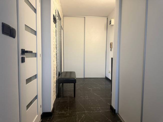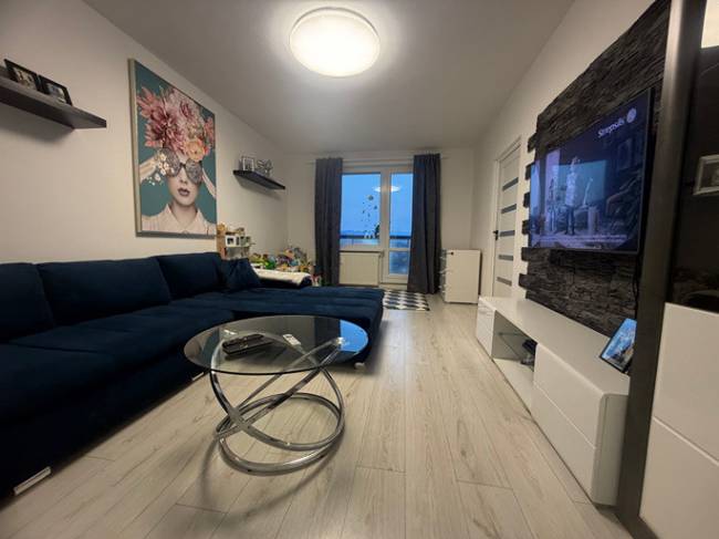 Okná sú plastové a pred 2 rokmi bola robená komplet revízia okien. V kuchyni a spálni sú žalúzie a v obývačke je tieniaci záves. V celom byte sú biele stierky + strop (veľmi dobrý stav). Podlahy sú v kuchyni a izbách jednotné, bledé laminátové, na chodbe je štýlová veľkoplošná dlažba. Na chodbe sú 2 vkusné, biele vstavané skrine na mieru s dostatkom úložného priestoru. Kuchyňa je so samostatnou špajzou a kuchyňa má aj jedálenskú časť. Kuchynská linka je zánovná a má plynovú varnú dosku, digestor, umývačku riadu, elektrickú rúru, nerezové umývadlo s batériou. Jadro je murované, kúpeľňa je s vaňou a samostatné WC je aj s umývadlom. Elektrické rozvody sú čiastočne menené a to v jadre a v kuchynskej linke. Interiérové dvere sú menené za vkusné biele z oceľovou zárubňou. Vchodové bytové dvere sú bezpečnostné. Obývačka je prechodná so spálňou. Z tohto bytu sa dá urobiť zmenou dispozície aj plnohodnotný 3 izbový byt.