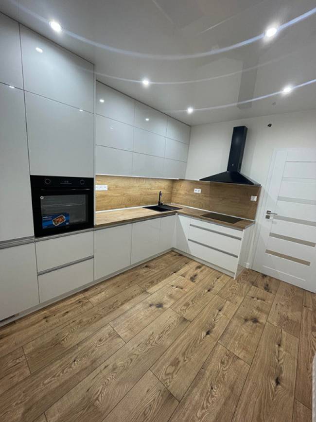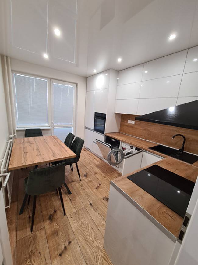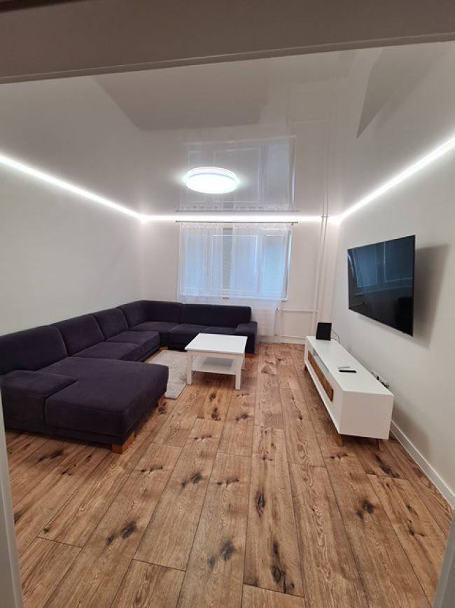 Popis bytu: izby sú neprechodné, nové rozvody elektriky, vody, odpadu. Nové vinylové podlahy, znížené stropy technológia napínacie stropy so zabudovaným led osvetlením, stierky nové biele, nové interiérové dvere s obložením zárubne, plastové okná so žalúziami, nová kuchynská linka do tvaru L (biely lesk) s led podsvietením kuchynskej linky, so zabudovanými spotrebičmi ako je chladnička s mrazničkou, indukčná varná doska, elektrická rúra, digestor, čierny granitový drez s batériou, umývačka riadu, pračka zabudovaná v kuchynskej linke, vchodové bytové dvere sú bezpečnostné. Na chodbe je vstavaná biela skriňa so zrkadlom a šatníková zostava. Kúpeľňa je murovaná s priestranným sprchovým kútom s vyhrievanou podlahou v kúpeľni a aj v sprchovom kúte. WC Geberit.